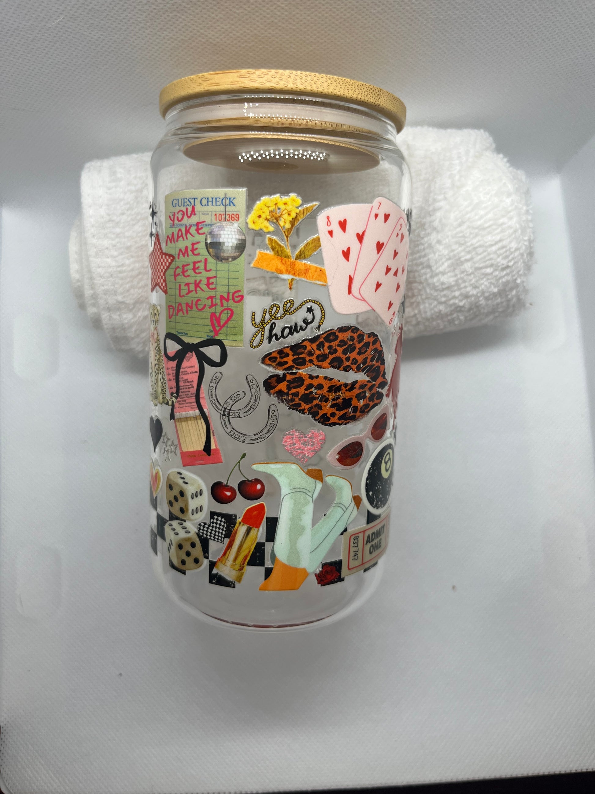 This 16 oz glass tumbler features a bold retro collage design with playing cards, dice, disco details, cowgirl boots, cherries, lipstick, bows, lucky symbols, and vintage-inspired accents. Finished with a bamboo lid, itβs perfect for iced coffee, cocktails, or everyday sipping with a fun, nostalgic vibe.