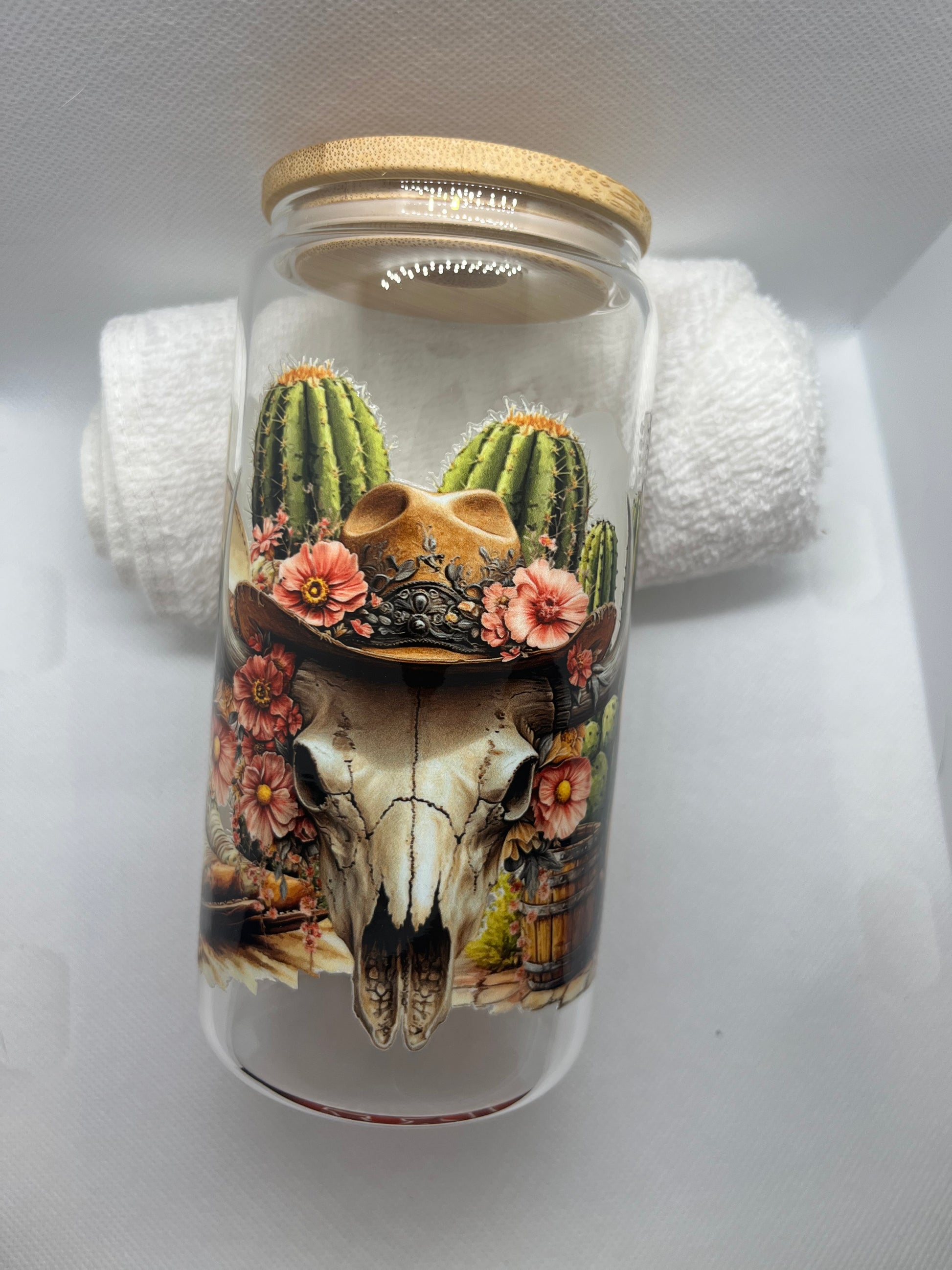 A stunning western-inspired glass tumbler featuring a rustic cow skull, desert cacti, florals, and warm earthy tones. Finished with a bamboo lid, this cup is perfect for iced coffee, tea, or your favorite cold drink. A must-have for boho, country, and western lovers.