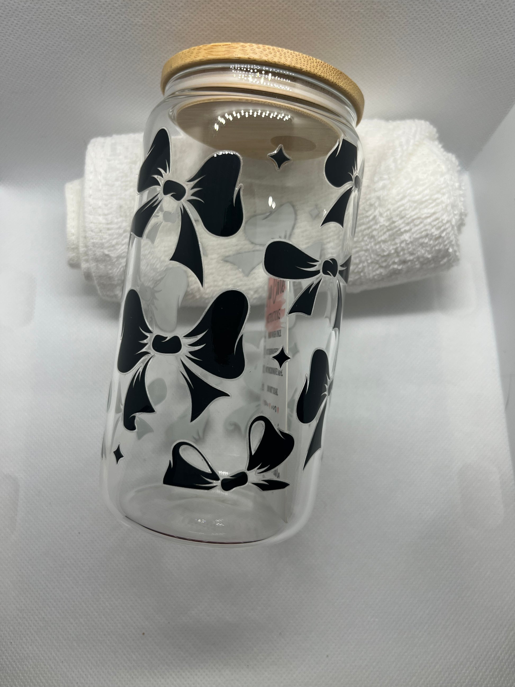 Simple, bold, and effortlessly chic π€ This 16oz clear glass can cup features an all-over black bow design with subtle spark accents for a coquette-goth aesthetic. Perfect for iced coffee, matcha, or cocktails, and finished with a bamboo lid for a modern, aesthetic look.