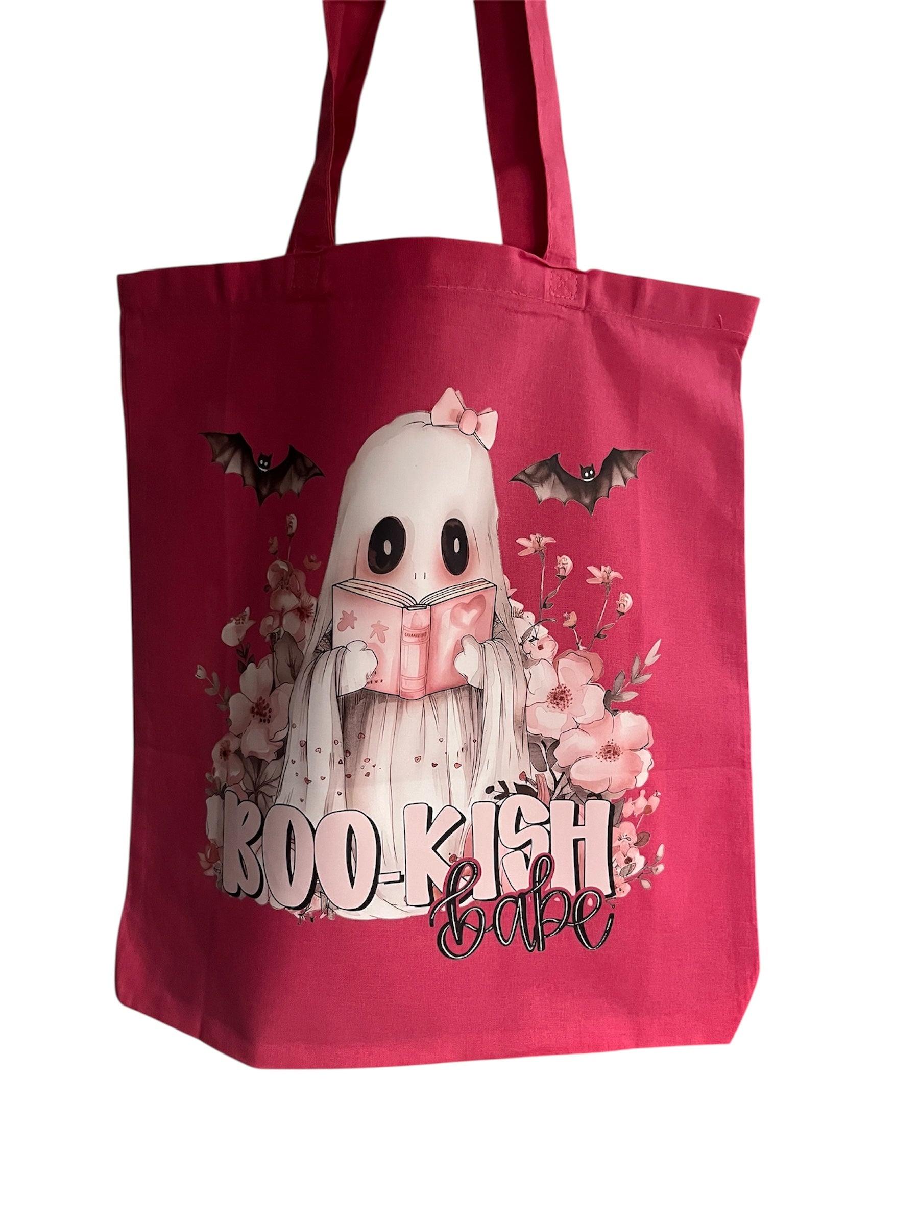 This pink canvas tote features an adorable ghost reading a book with the phrase “Boo-kish Babe.” Perfect for book lovers who adore cozy Halloween vibes all year long.