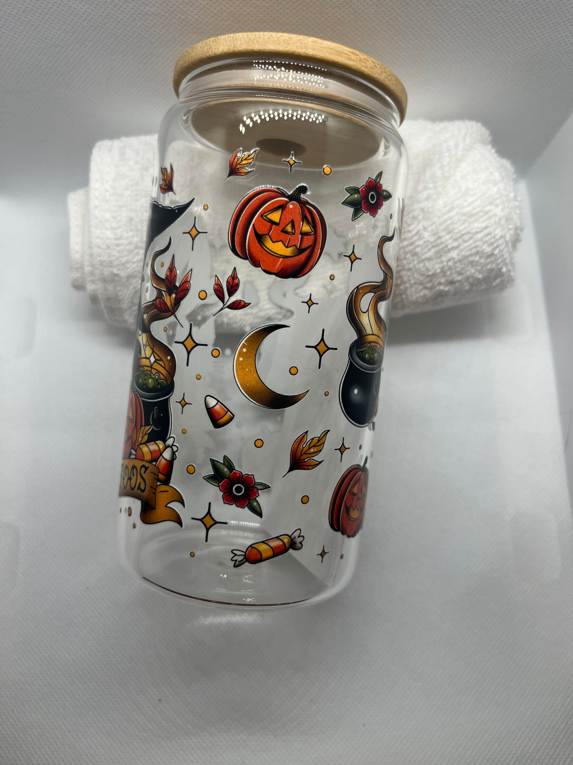 Sip something magical 🖤✨ This 16oz clear glass can cup features a bold witch illustration with tattoo-style details, pumpkins, potion brews, and fall accents. Finished with a bamboo lid, it’s perfect for iced coffee, cold brew, or spooky seasonal drinks—made for witchy souls who love art, ink, and autumn vibes.