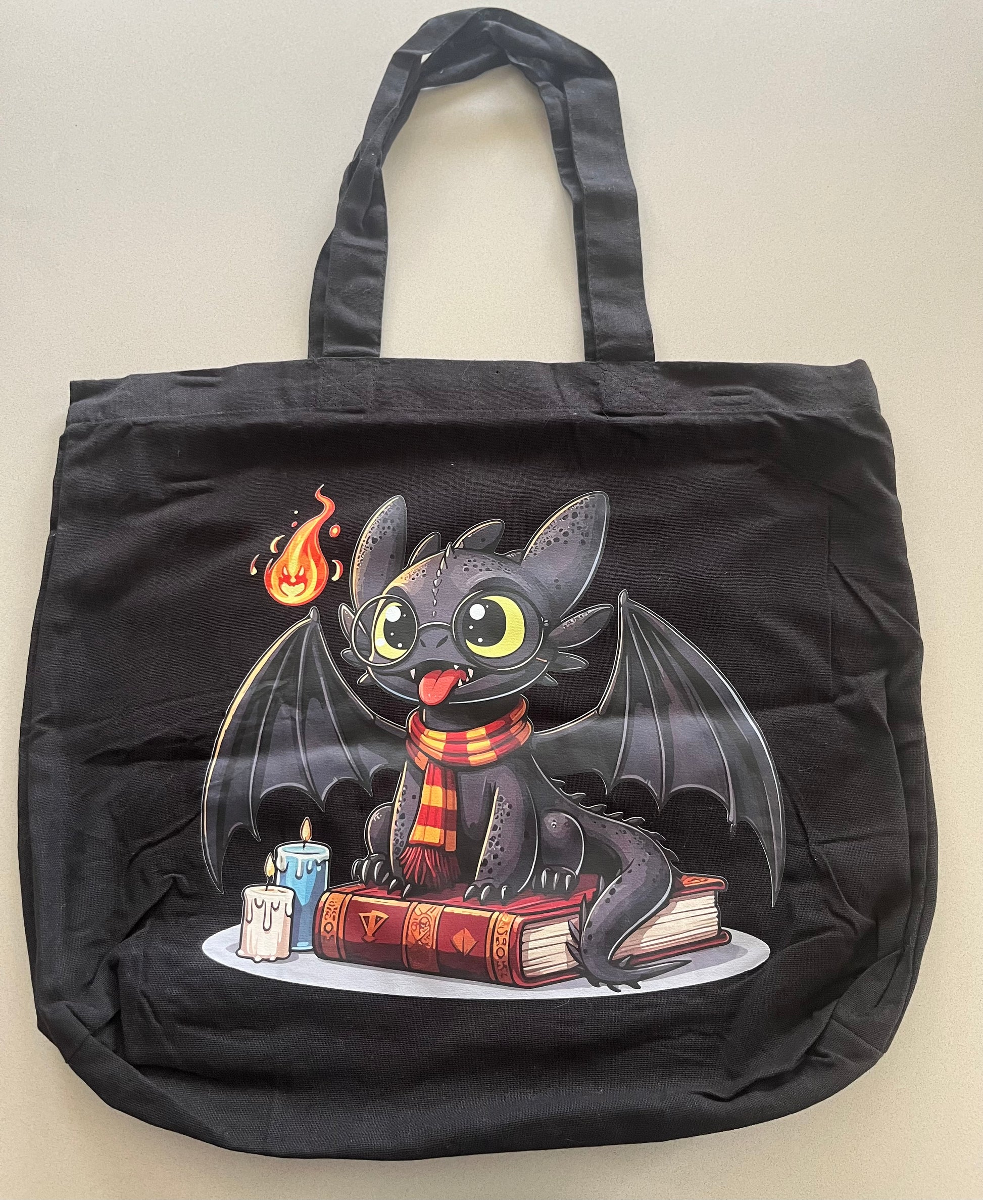 Black canvas tote featuring an adorable fantasy dragon perched on spell books with candles and magical details. Perfect for book lovers, fantasy fans, librarians, and cozy readers. Sturdy and reusable—ideal for carrying books, shopping, or everyday essentials with a touch of magic. 🐉✨📚