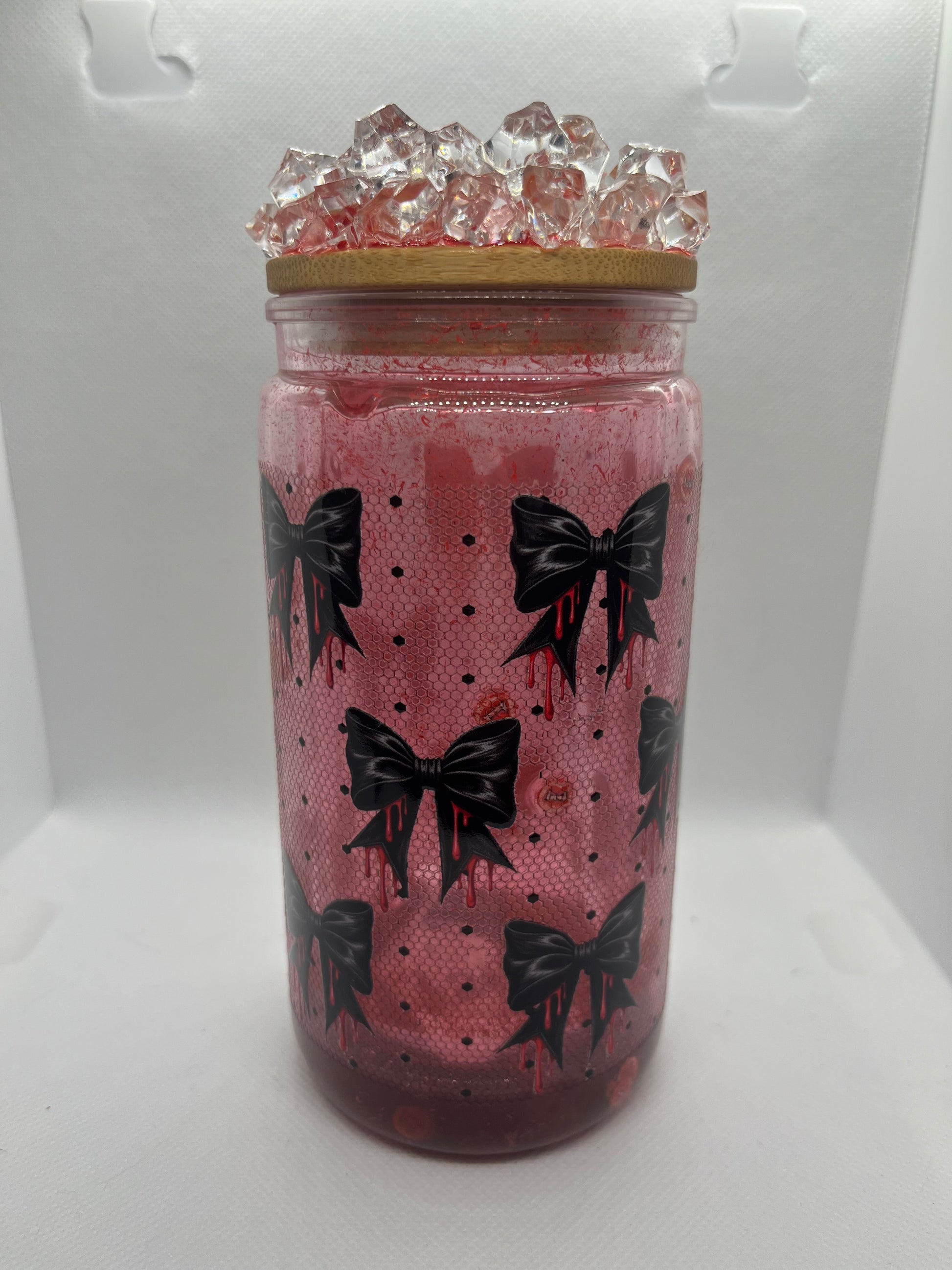Make a bold statement with this 16 oz plastic tumbler featuring an all-over black bow design, deep pink tones, and a glam crystal-style topper lid. Lightweight and eye-catching, this tumbler is perfect for cold drinks and anyone who loves dark coquette, edgy glam aesthetics.