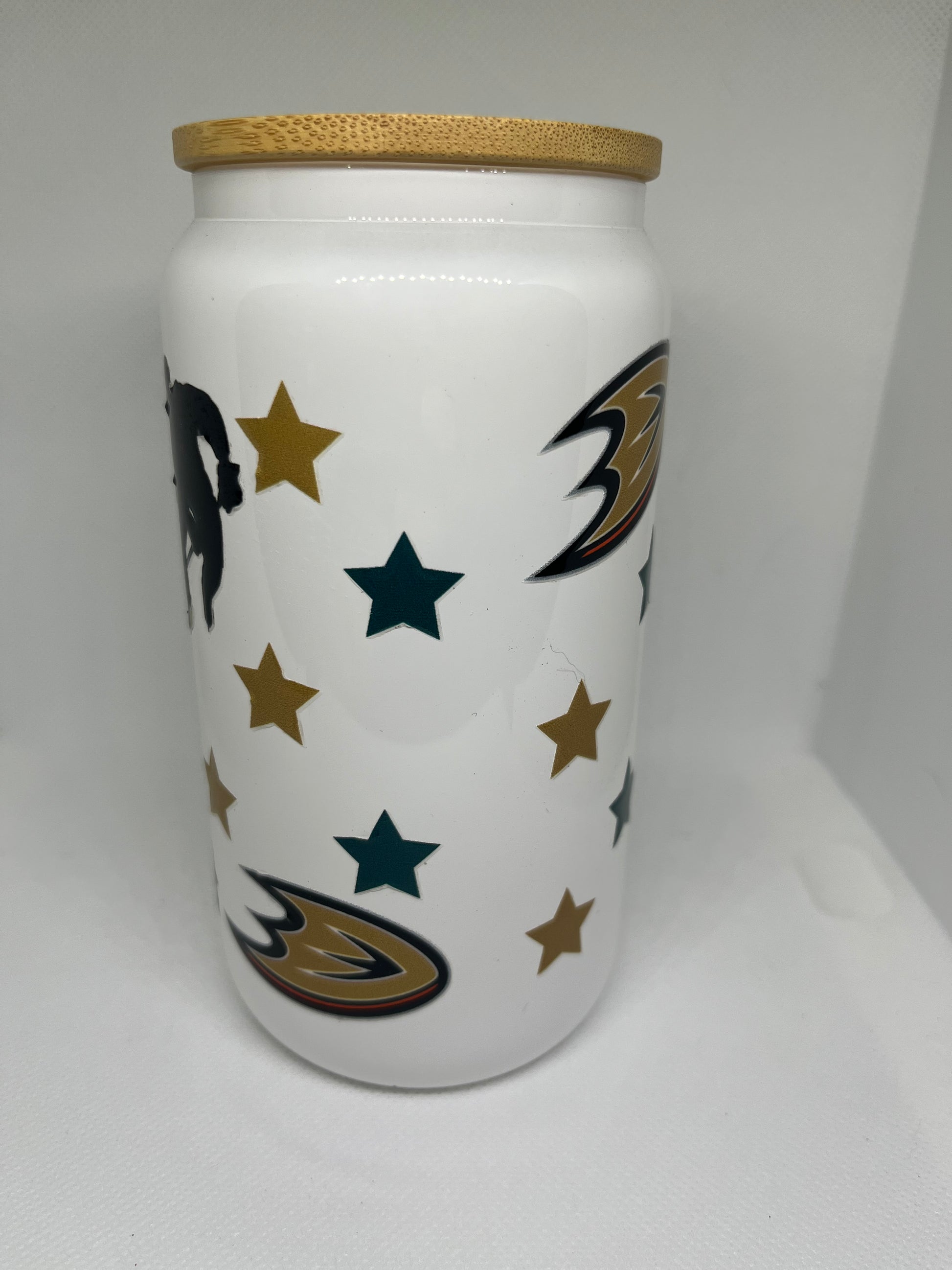 Channel classic hockey vibes with this 16 oz white glass cup featuring a bold duck mask design, crossed sticks, and star accents inspired by iconic rink-era style. Perfect for iced coffee, tea, or your favorite cold drinks. Finished with a natural bamboo lid, this cup is a must-have for hockey fans and nostalgic sports lovers.