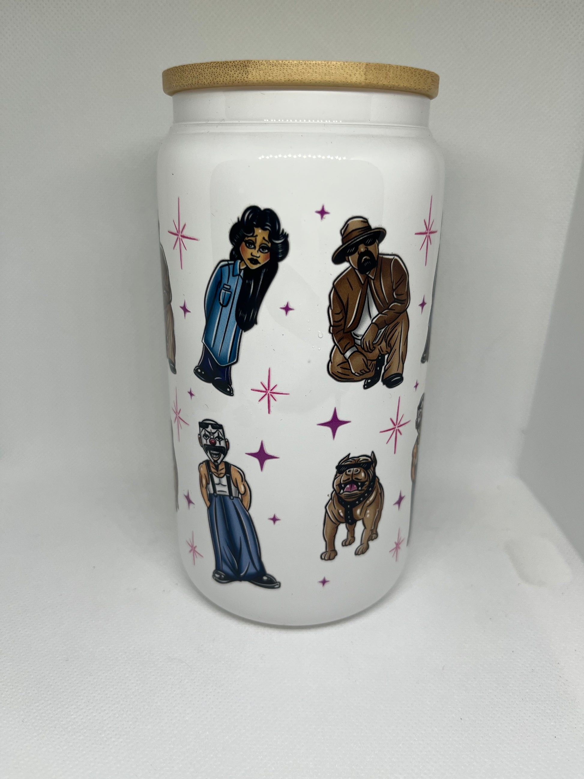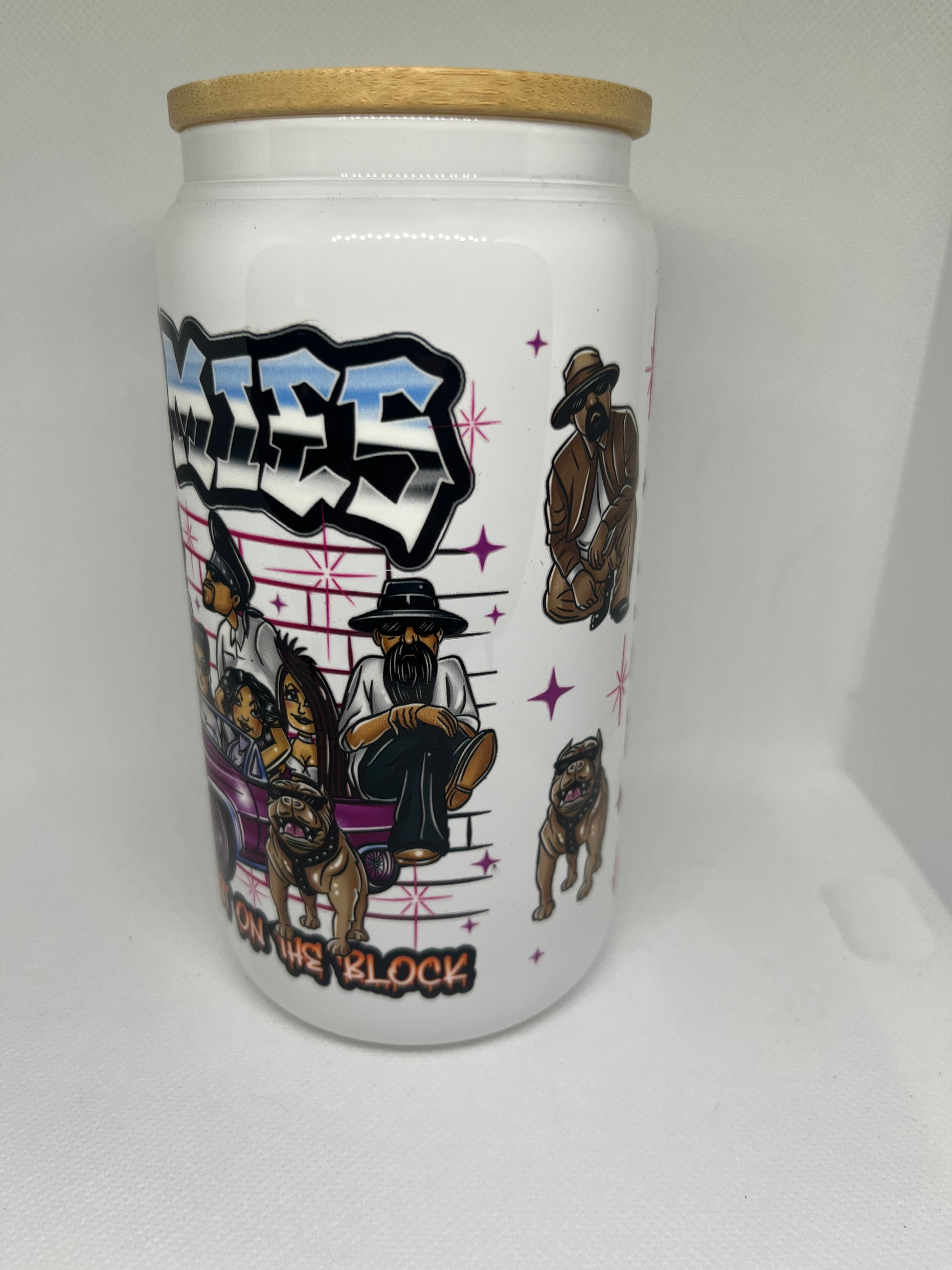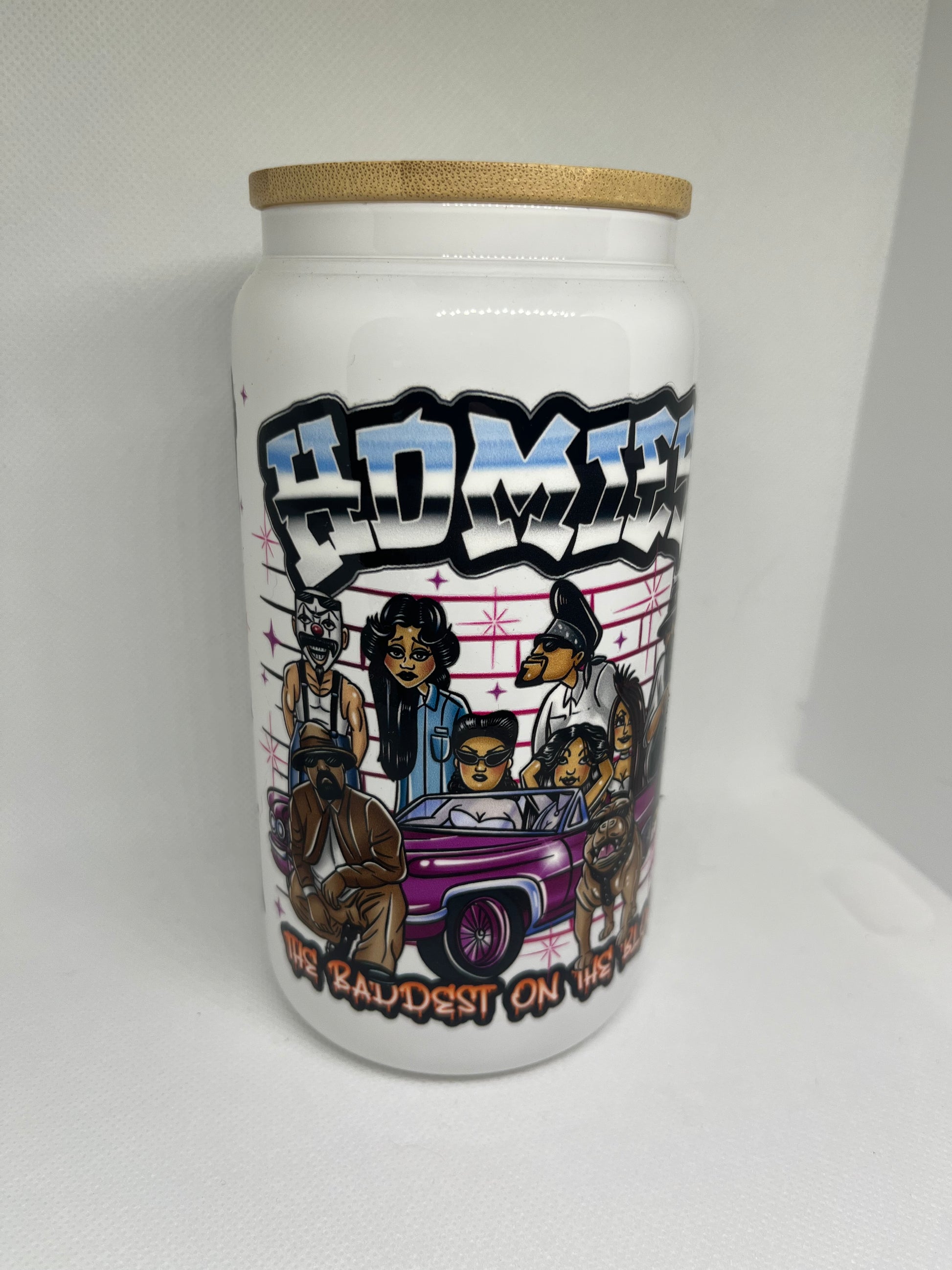 Bring the block party vibes to your drinkware. This 16 oz white glass can features a bold homies-inspired cartoon design with colorful characters, star accents, and throwback street style energy. Perfect for iced coffee, tea, or your favorite cold drinks, finished with a natural bamboo lid for an everyday statement piece.