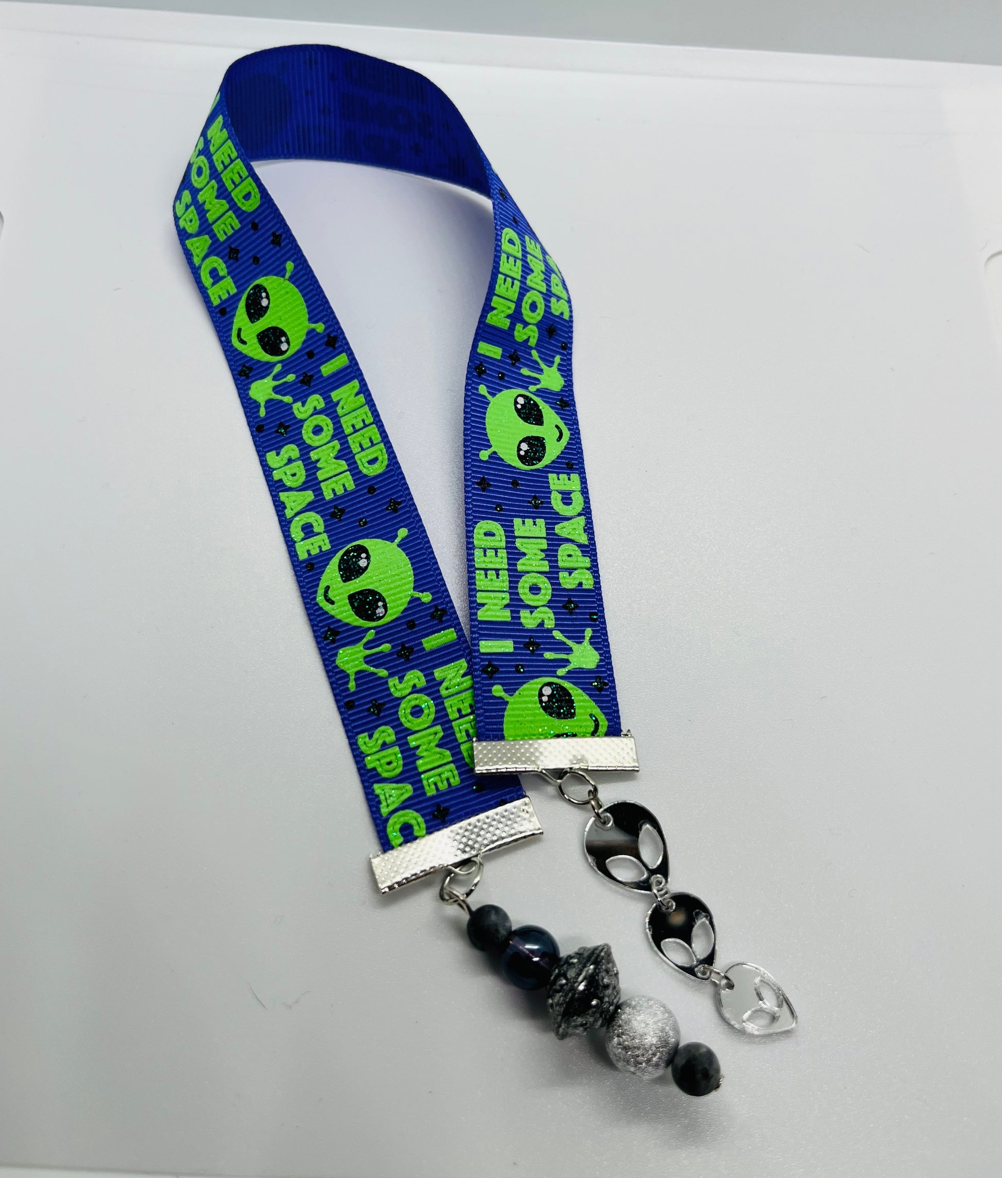 For readers who love cosmic vibes, this handmade ribbon bookmark features a bold blue alien print with playful “I Need Some Space” text, finished with silver galaxy-inspired beads and alien charms. Perfect for sci-fi fans, quirky readers, and anyone who enjoys a little humor with their books. A fun, out-of-this-world gift for bookmarks lovers. 👽📖✨