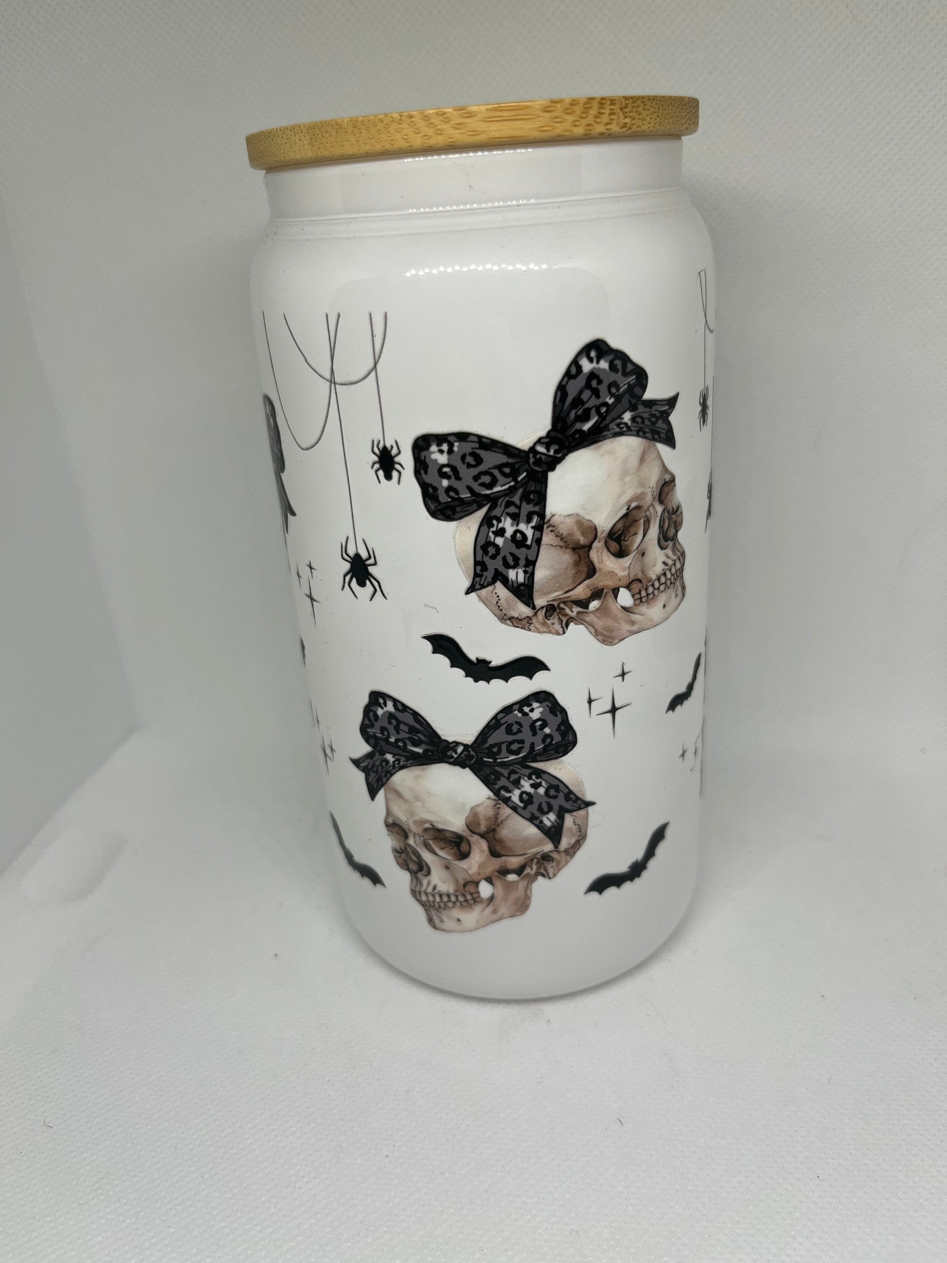 Spooky meets stylish with this 16 oz white glass can tumbler featuring skulls adorned with leopard-print bows, bats, spiders, and celestial accents. Made from solid white glass (not frosted), this eye-catching cup is perfect for iced coffee, cold brew, or your favorite drink. Finished with a bamboo lid, it’s a must-have for gothic, Halloween, and year-round spooky vibes.