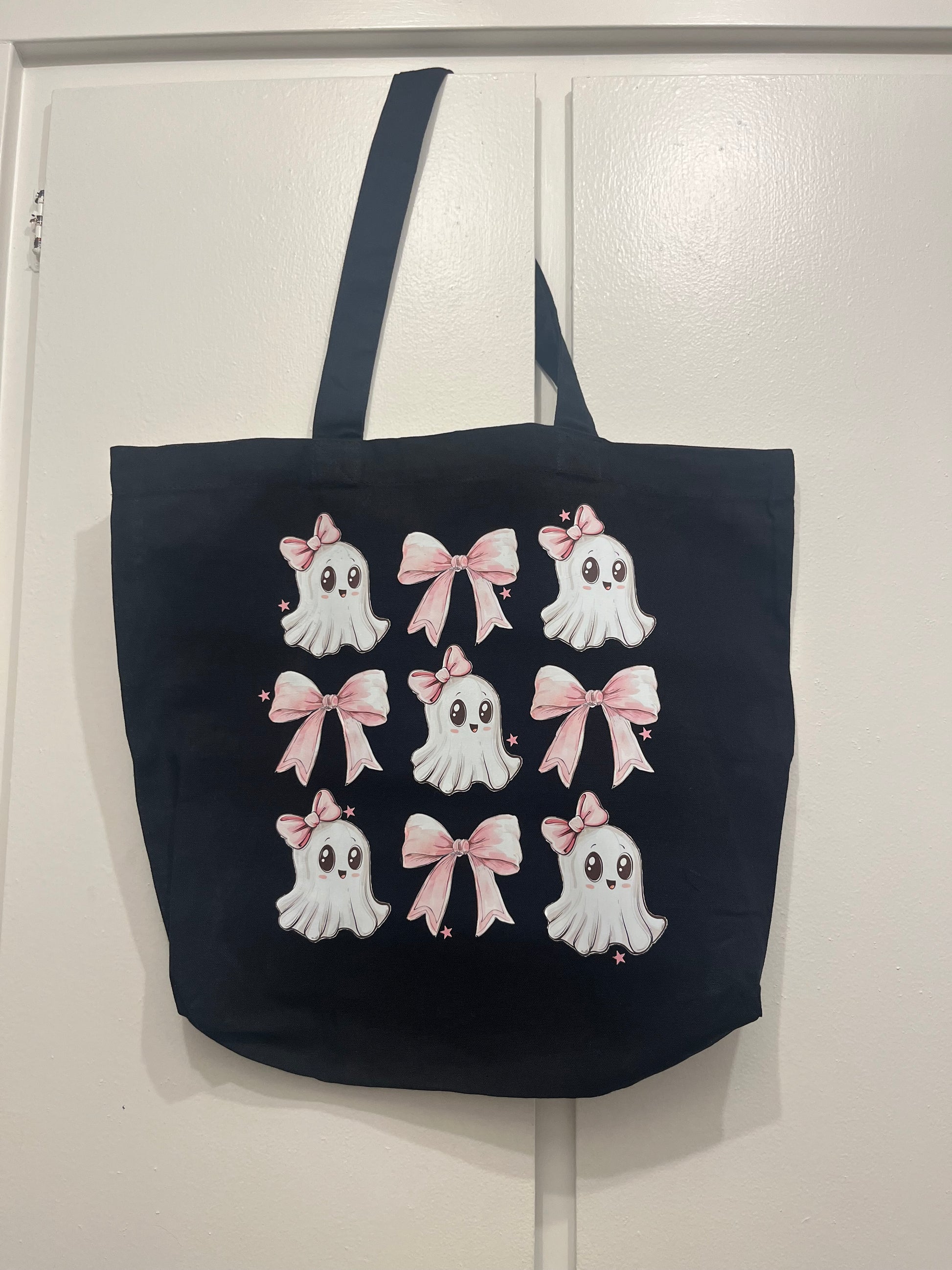 This black tote bag features an adorable pattern of cute ghost faces and soft pink bows for the perfect spooky-sweet look. Lightweight, reusable, and roomy enough for everyday essentials, itβs great for shopping, school, or gifting to any ghost or Halloween lover π»π