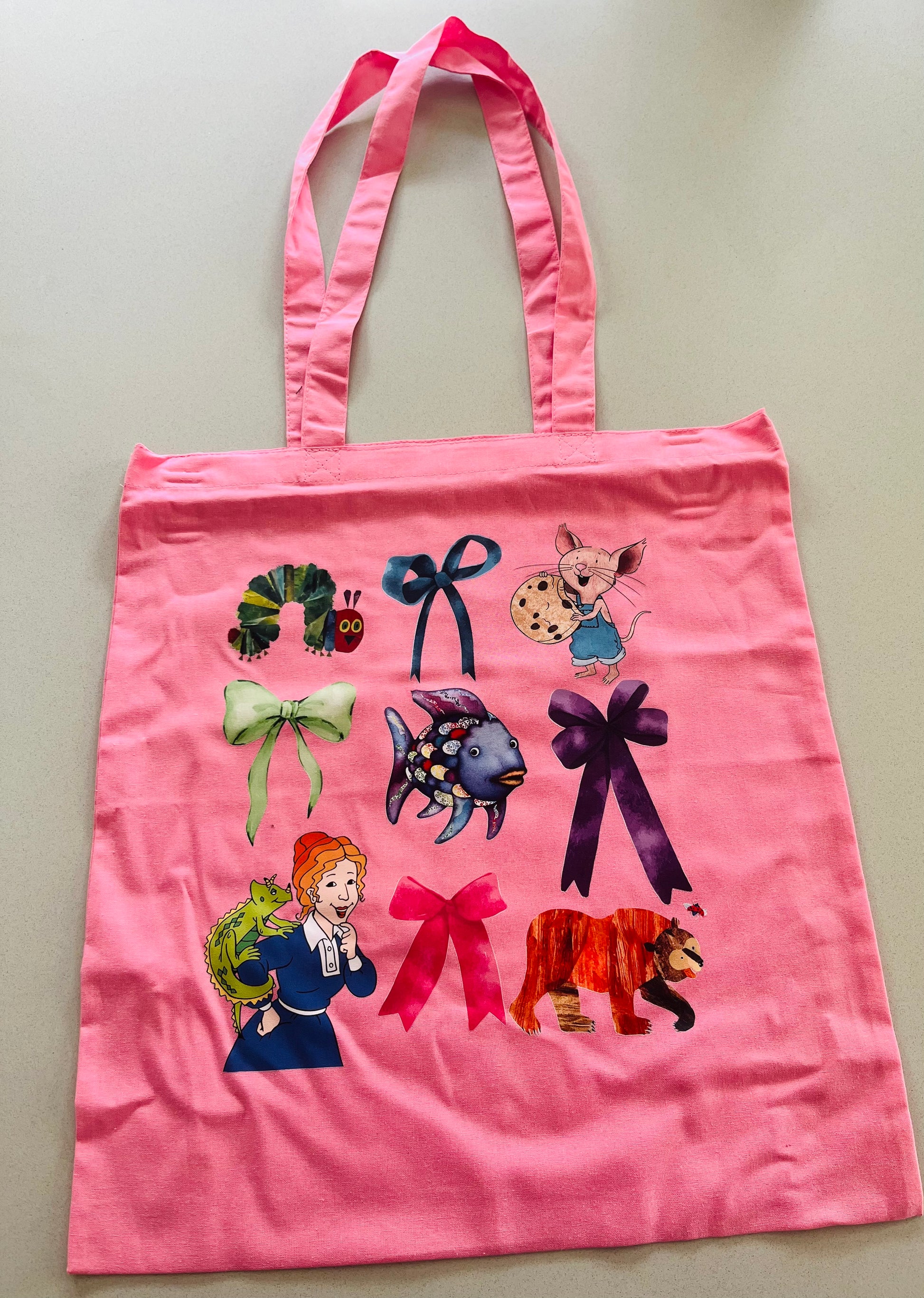 Bright pink canvas tote featuring whimsical storybook characters, playful animals, and cute bow accents. Fun, nostalgic, and perfect for everyday errands or adding a pop of personality to your look.
