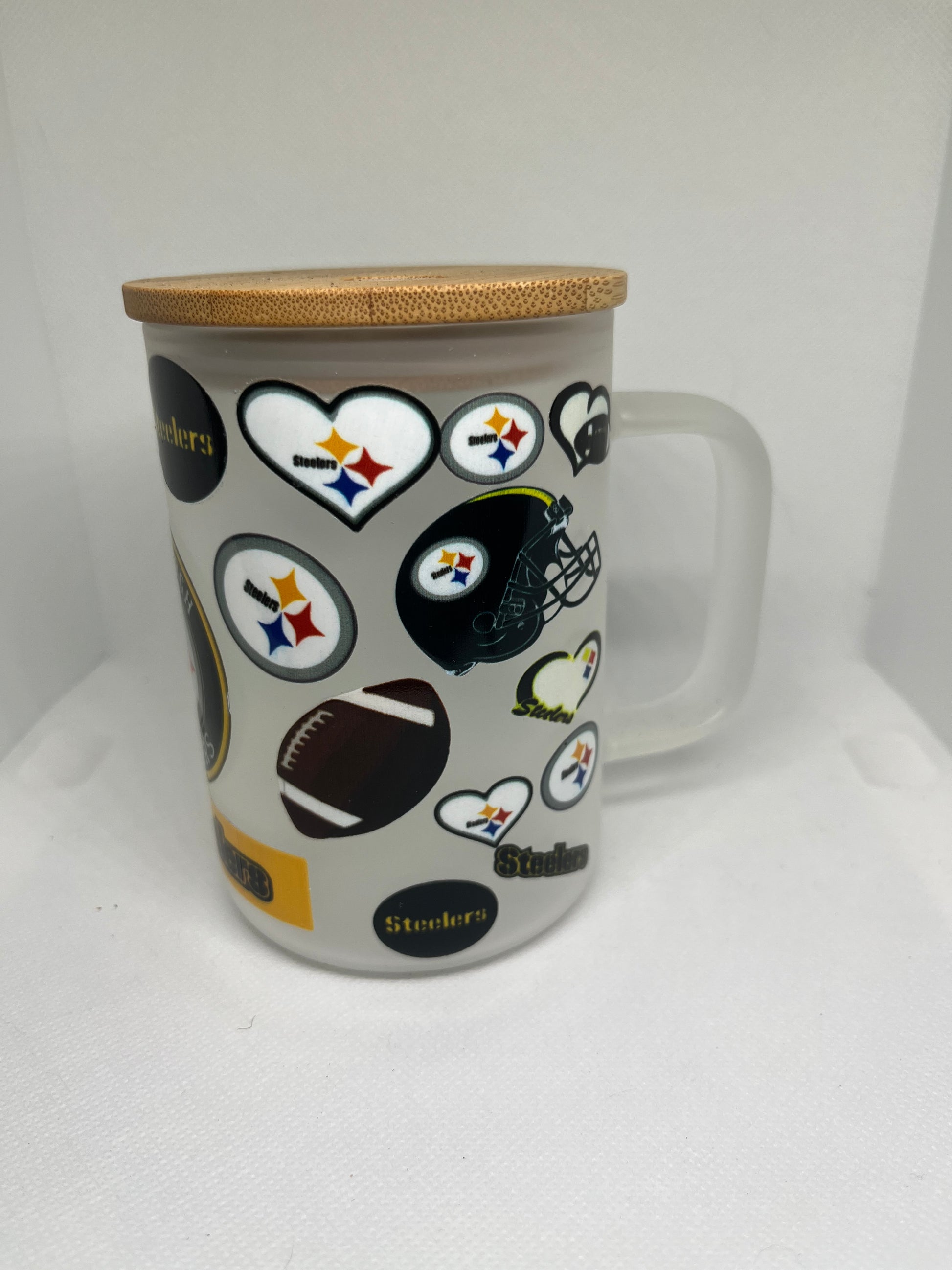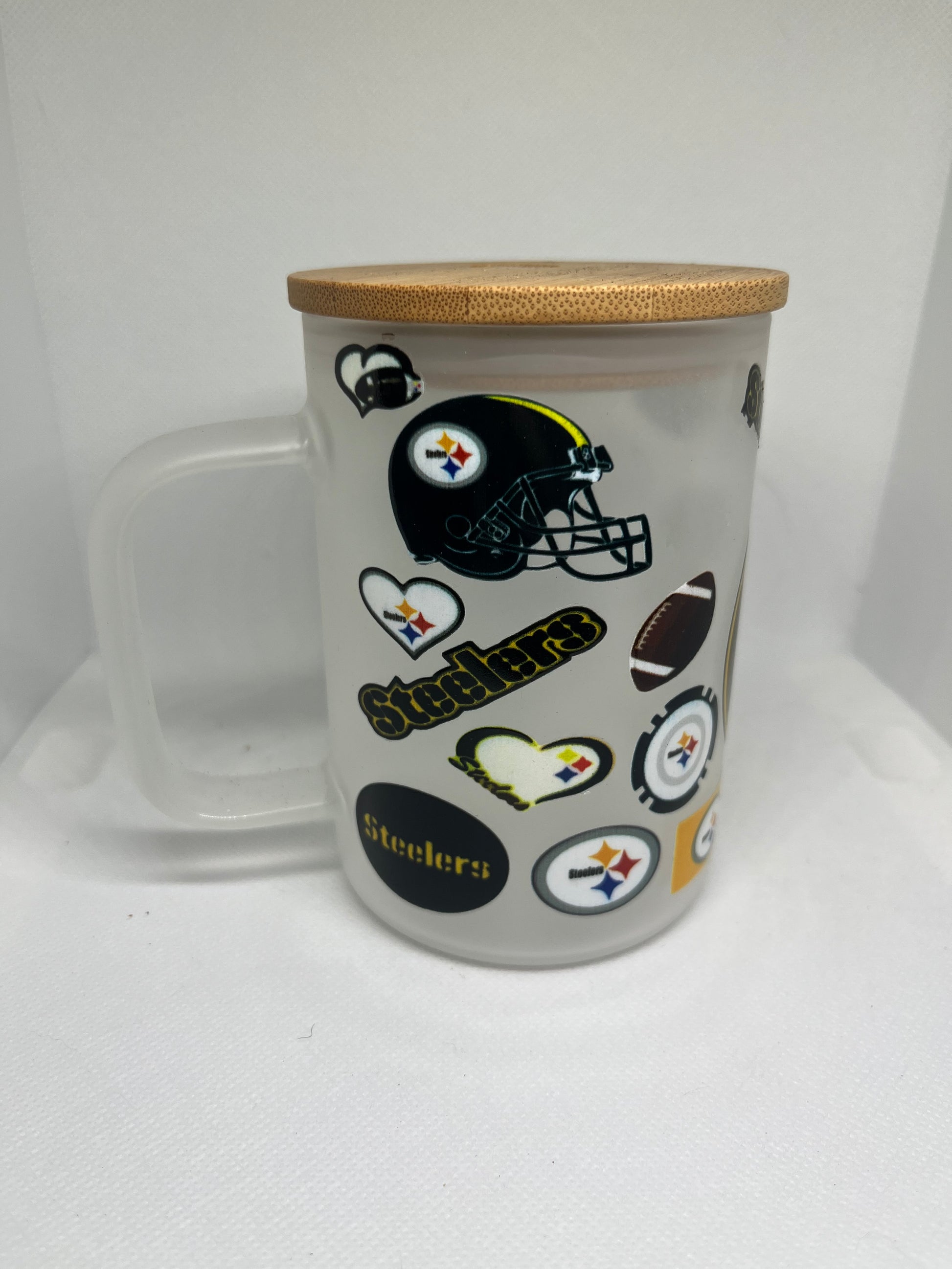 Pittsburgh Football Fan Frosted Glass Mug with Bamboo Lid