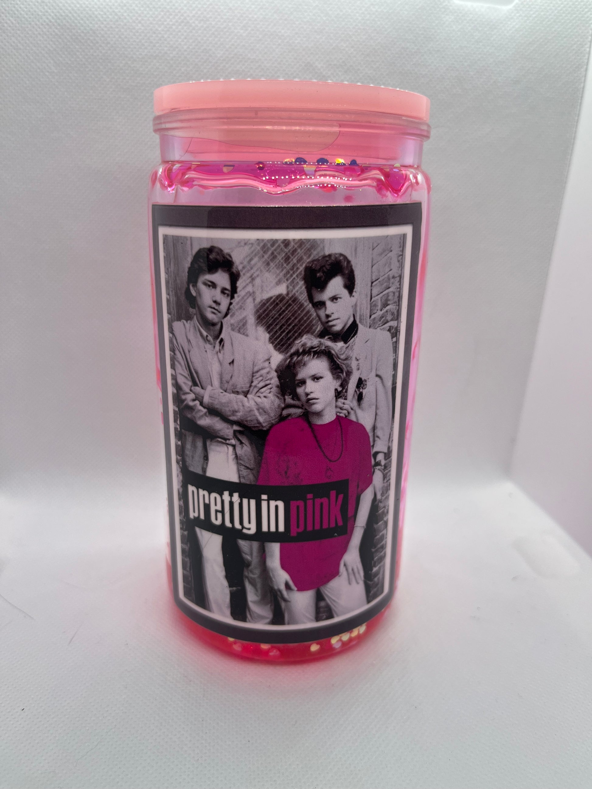 Sip in total 80s nostalgia with this 16 oz plastic tumbler inspired by Pretty in Pink. Featuring a pink swirl design with floating glitter and a matching pink lid, this lightweight cup is perfect for iced coffee, tea, or your favorite cold drinks.