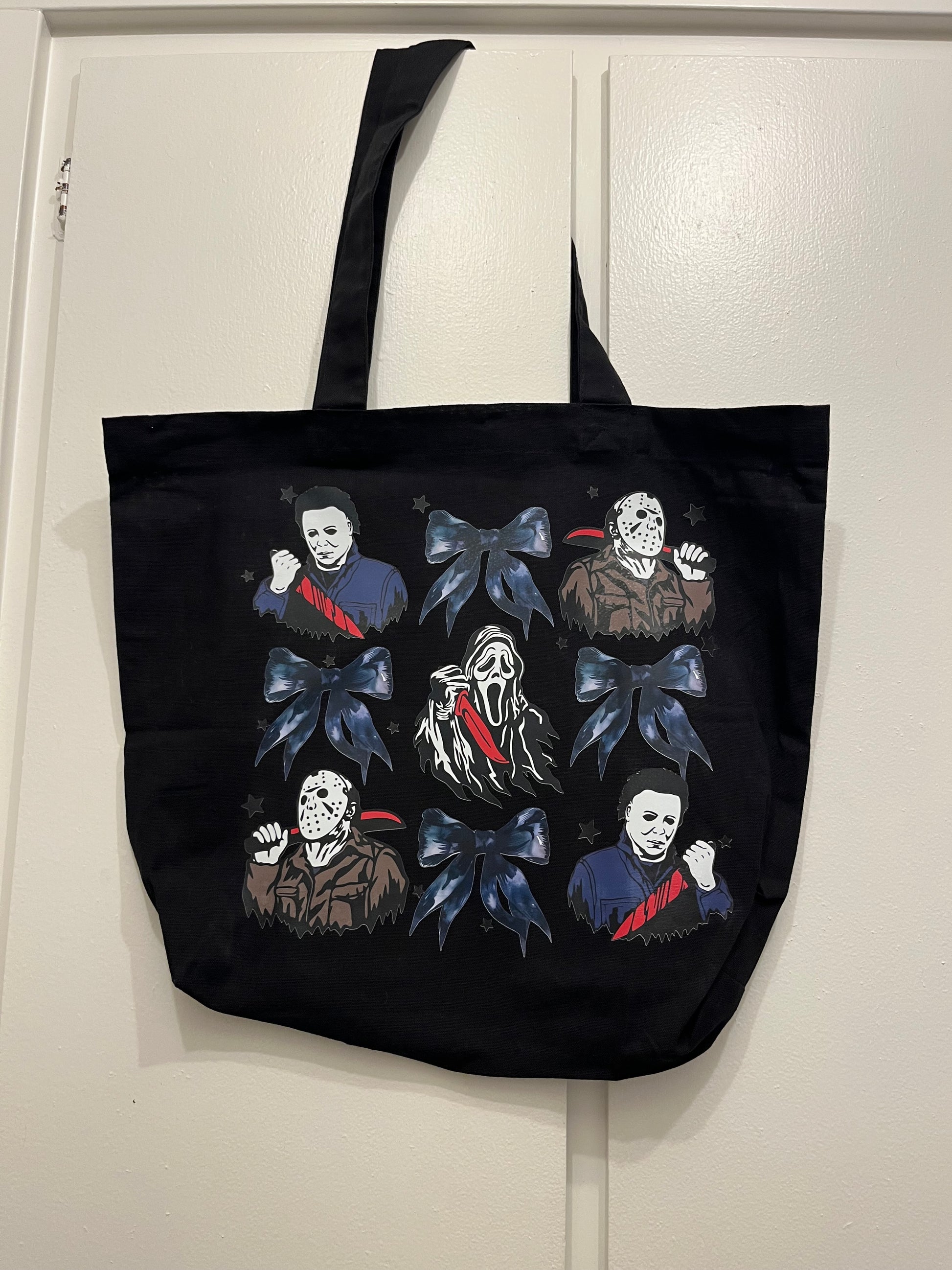 This black tote bag features a bold grid of classic slasher-inspired horror figures accented with elegant bows and subtle star details. Designed for horror lovers who appreciate both creepy and chic, this tote is perfect for spooky season, conventions, shopping, or everyday errands with an edge. Reusable, durable, and guaranteed to make a statement.