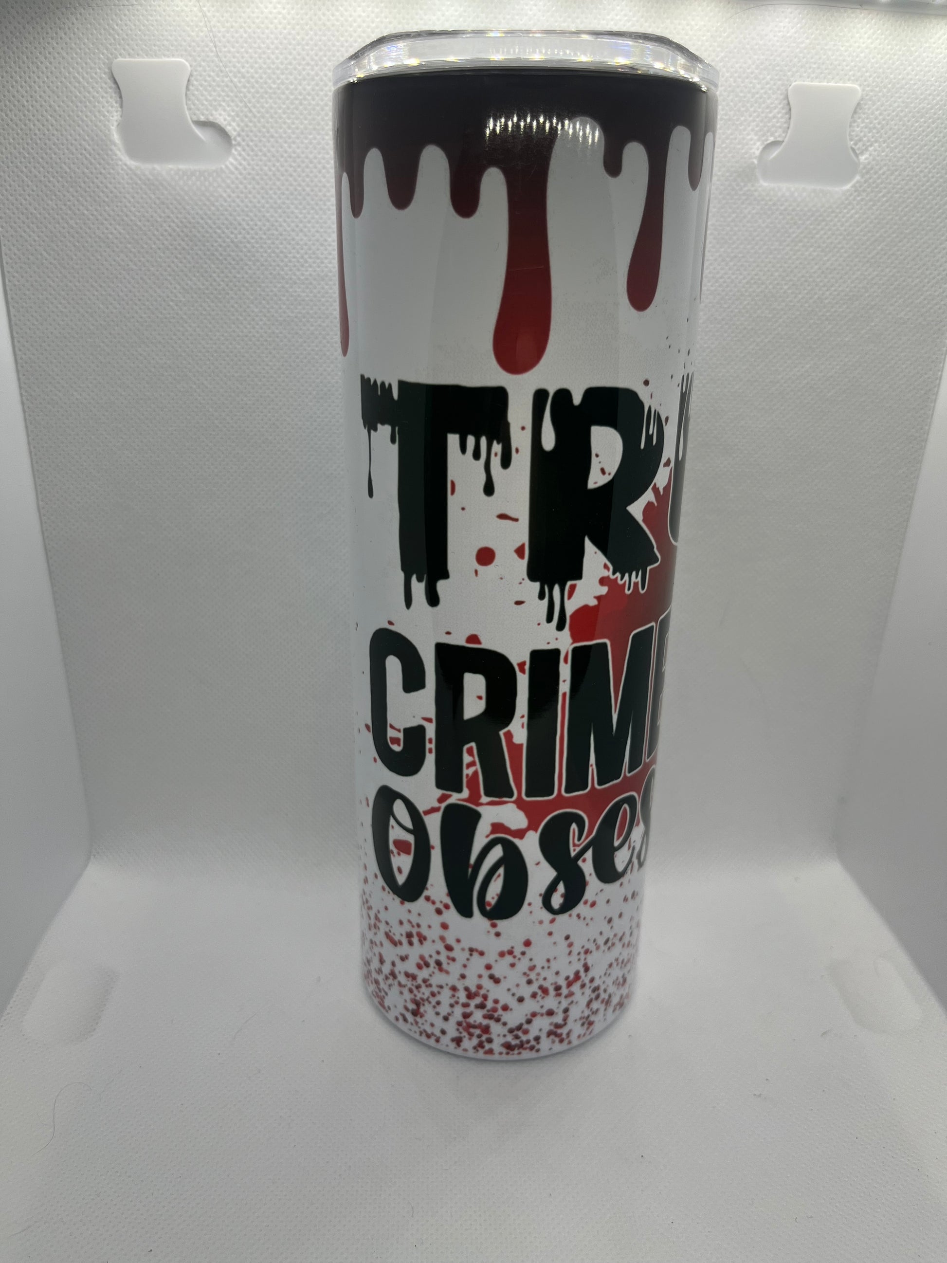 Stay chillingly hydrated with this 20 oz stainless steel tumbler featuring a bold “True Crime Obsessed” horror-inspired design. With dripping blood details and a creepy true-crime aesthetic, this insulated tumbler keeps drinks hot or cold for hours—perfect for true crime fans who love dark style with everyday function.