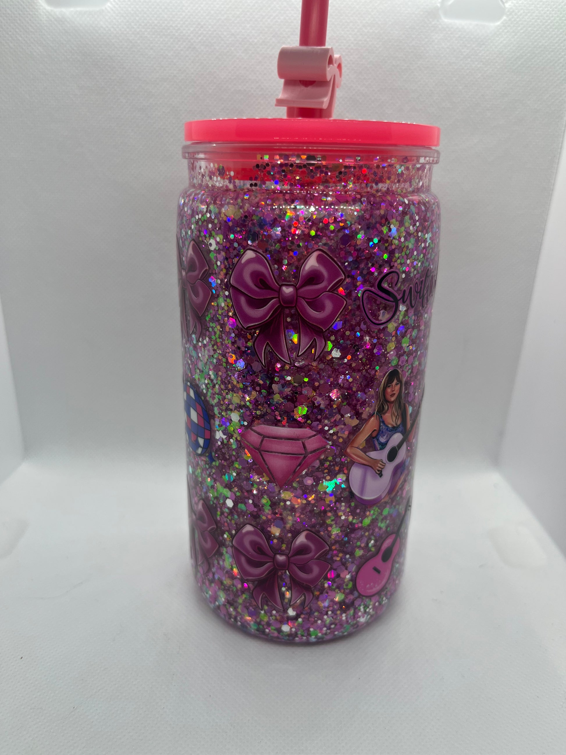 Sparkle with every sip! This 16 oz pink glitter snow globe tumbler features Swiftie-inspired designs, bows, guitars, and disco vibes for the ultimate pop-lover aesthetic. Made from lightweight plastic with a matching lid and straw, it’s perfect for iced coffee, tea, or your favorite drink on the go. A must-have for Swifties who love all things pink, sparkly, and extra 💕🎶